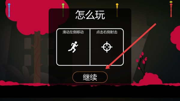在玩法说明界面仔细查看并理解了“滑动左侧控制移动、点击右侧进行射击”的玩法规则后,即可进入战斗环节,此时点击继续按钮即可。