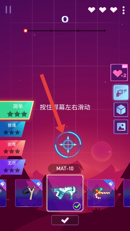 在射击闯关游戏里,你可以按住屏幕左右滑动来调整瞄准方向,选择简单难度和MAT-10武器后,就能开启游戏了。