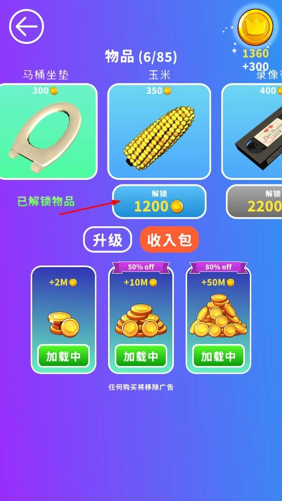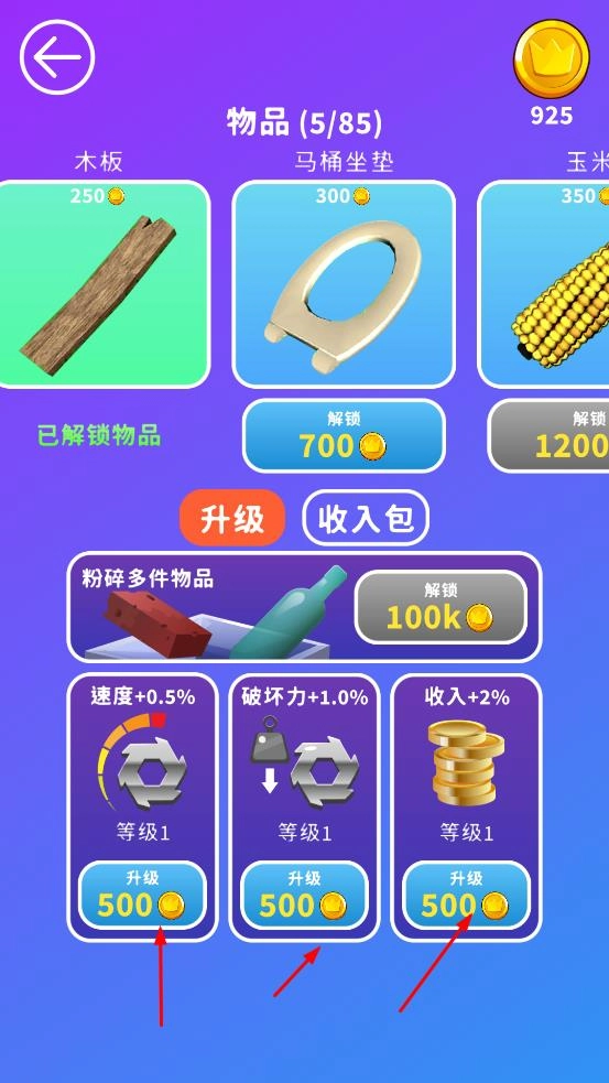 用金币解锁木板、马桶坐垫、玉米等更多可粉碎物品,以此丰富可操作内容,拓展游戏玩法。