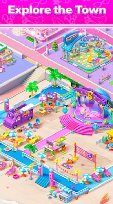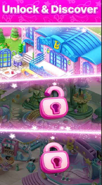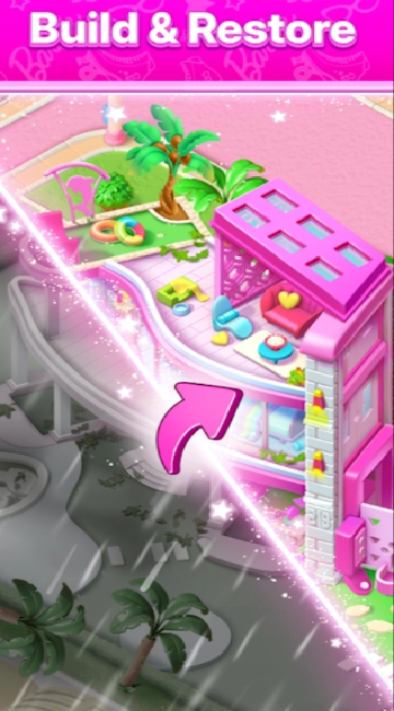 把经典的“合成-消除”玩法和芭比IP的梦幻世界融合起来,你可以通过合成物品、完成订单,助力芭比修复被神秘粉红雾气毁坏的家园。