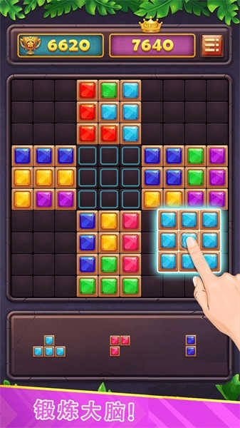 1、趣味十足,让人沉浸其中不愿停下 把各种形状的方块拖动到棋盘中。