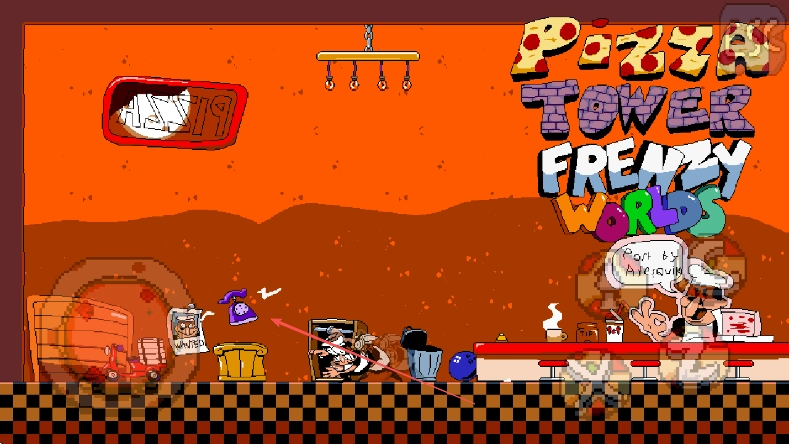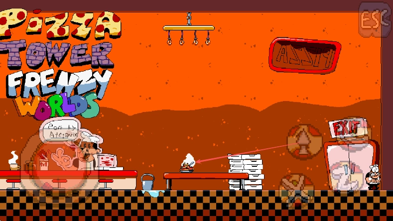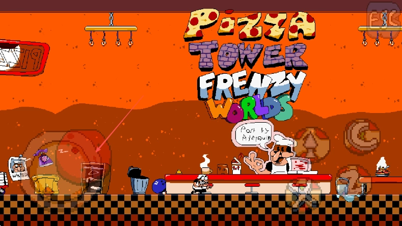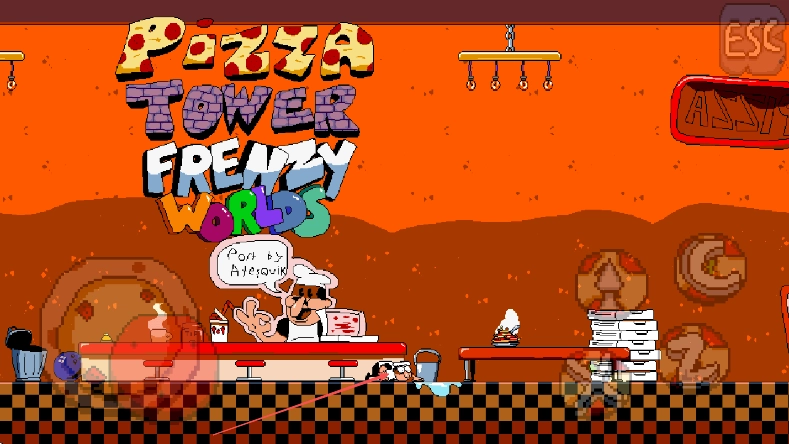 进入《PizzaTowerFrenzyWorlds》游戏,留意披萨店的场景布局以及角色所处的位置。