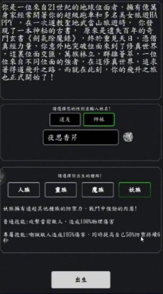 创建角色,选定灵根,踏入修仙世界,开启初始修炼之旅。