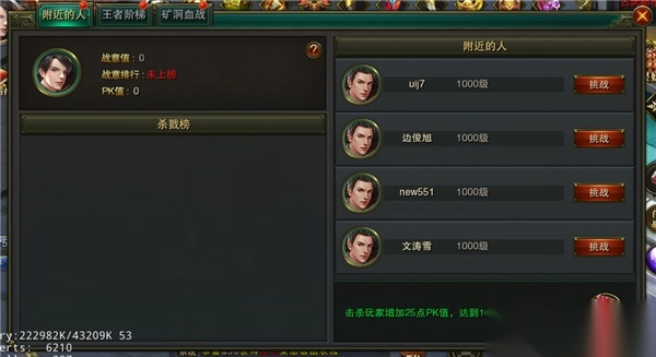 竞技玩法包含附近的人、王者阶梯、矿洞血战这三种PK模式!