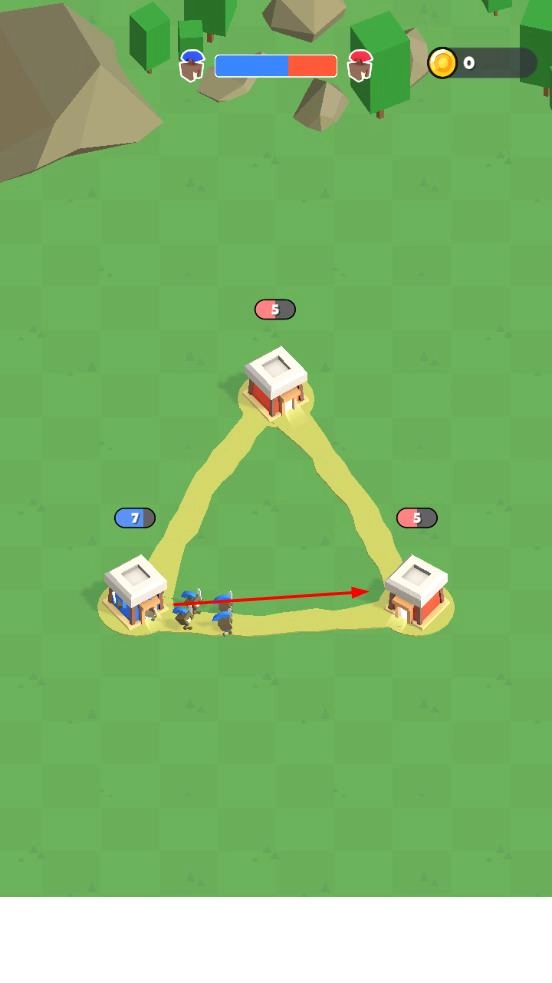 你需要指挥蓝色阵营的士兵在建筑之间移动,与红色阵营展开对抗,通过合理调配兵力来攻占对方的建筑。
