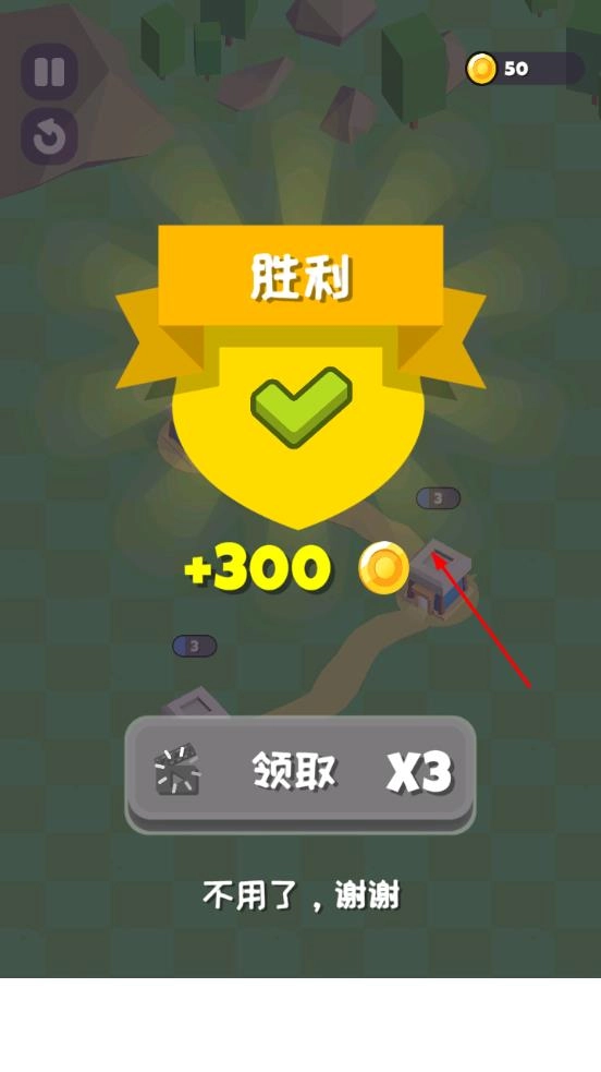 成功获胜后,界面会显示“胜利”字样,同时获得金币奖励,此时可选择领取奖励或点击“不用了,谢谢”。
