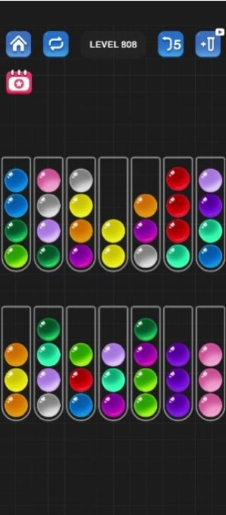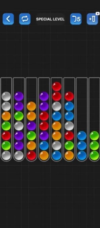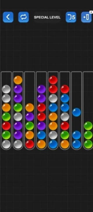 持续调整与尝试,探寻最优路径,把所有彩球归类到相应的管子中。