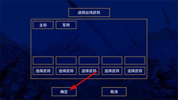在选择出场武将的界面,选好主将、军师以及其他武将后,点击确定按钮就能确认阵容,开始战役。