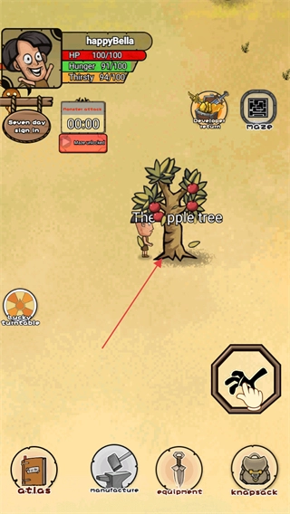 找到Theletree后,点击互动按钮收集苹果,以此补充饥饿值。