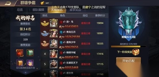 群雄逐鹿的赛事模式采用阶梯式进阶机制。处于青铜段位时,玩家仅能派出一支队伍参与对战。首先需完成队伍的编排配置,随后点击开启匹配功能,系统便会为其匹配到段位相近的对手。