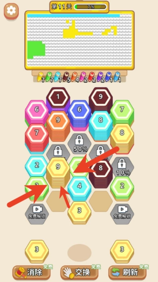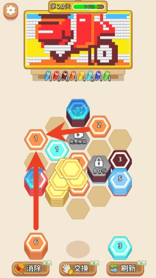 遇到特殊锁定区域时,得先把周边区域填充好,灵活运用交换、刷新这类道具来攻克难关,最终实现完美填色。