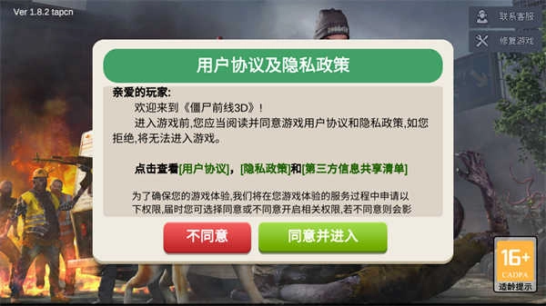 首先启动已准备好的游戏,进入游戏界面后会出现用户协议弹窗,点击“同意”按钮即可进入游戏。