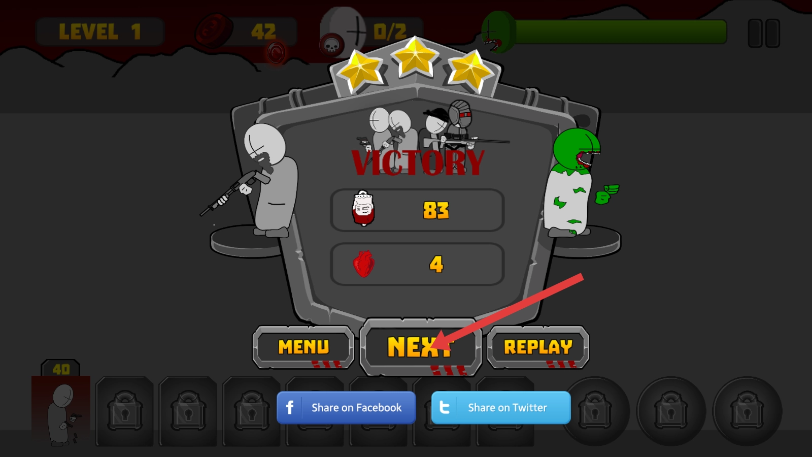 成功消灭所有僵尸后,点击NEXT按钮进入下一关,继续挑战实力更强的敌人,以此积累更多的资源与经验。