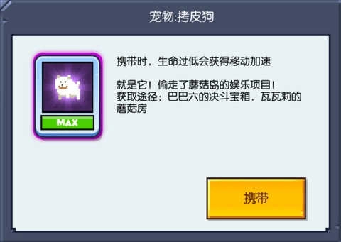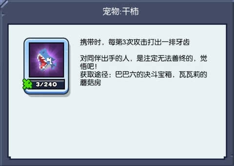 这是你的一只小狗,带着它的时候,能让你在生命值偏低时提升移动速度。生命值过低时通常需要做什么?当然是赶紧跑啦。所以这只拷皮狗绝对能帮你提高生存概率,游戏里这只可爱的白色小狗还会摇着尾巴撒娇卖萌,各位铲屎官可要留意咯。