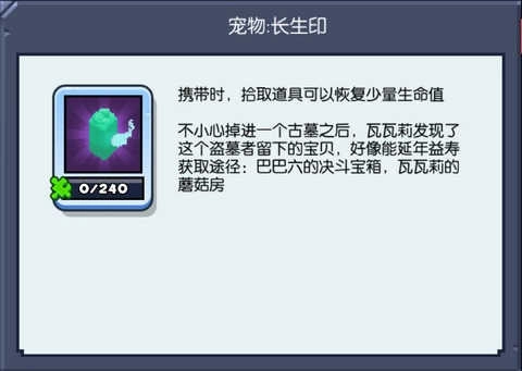 这是瓦瓦莉不慎坠入一座古墓后偶然发现的物件,原来是某个盗墓者遗留的宝物。单从它散发出的气息判断,似乎有着延年益寿的功效——尽管真假难辨,但随身携带后,确实能在拾取道具的瞬间恢复些许生命值,这无疑让她在蘑菇岛的生存概率大大提升了。