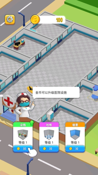 医院刚开始只有基础医疗设备,玩家能利用治疗病人得到的金币来升级设备,设备的等级越高,诊疗的效率和病人的满意度提升效果就越显著。