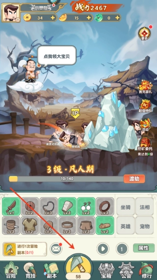 进入游戏,点击“铁镐”图标敲击矿山获取装备;