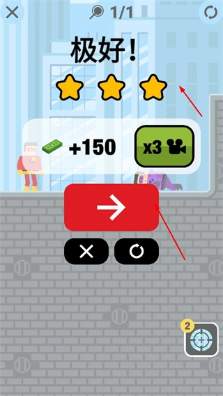 任务成功完成后,你将得到金币等奖励,系统还会给出星级评价;此时你可以选择继续游戏,或者通过观看视频来获取额外奖励。