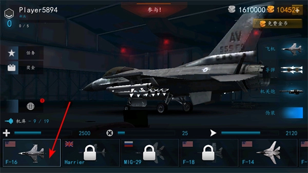 进入机库界面后,选择F-16等适配战机,完成战斗前的装备准备工作。