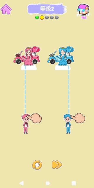 画线到家是一款益智闯关类游戏,采用简洁的卡通美术风格,搭配趣味十足又考验脑力的解谜机制。在游戏里,玩家需要通过在屏幕上绘制线条,引导新郎沿着线条移动至新娘所在位置,以此达成关卡目标。随着游戏进程的深入,后续关卡会加入更多类型的障碍与规则限制,玩家需要运用更具创意和策略性的画线方式来谜题,才能顺利通关。