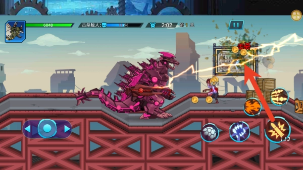 进入关卡战斗环节,你可以选择剧情模式或挑战模式开启关卡。在战斗中,借助虚拟摇杆来操控你的机甲恐龙进行移动,同时点击技能按钮就能对场景里的敌人展开攻击。