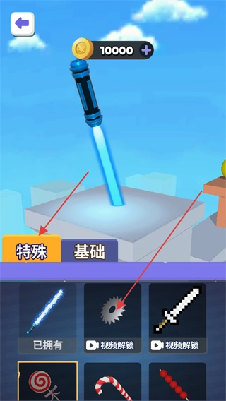 进入武器选择界面后,你会看到特殊刀具和基础刀具这两个类别。其中,特殊类刀具需要通过观看视频才能解锁,玩家可以依据自己的实际需求来进行挑选。
