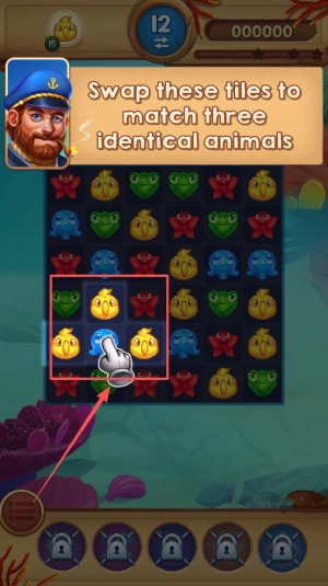 4、开始消除:按提示“Swap these tiles to match three identical animals”交换相邻动物,连成三个即可消除。