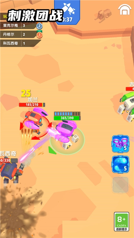 3.团队对抗:两队对抗,争夺资源并消灭敌方机甲。