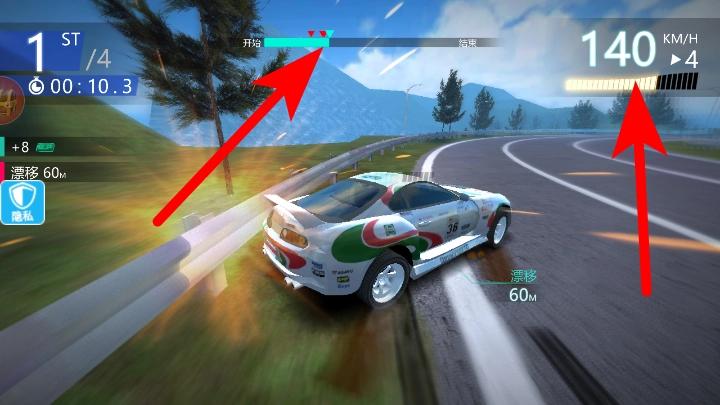 3、比赛过程中要留意进度条和车速,通过漂移操作来维持领先的排名。