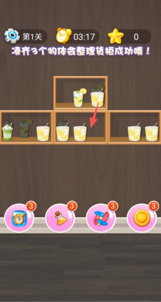 1、按照“凑齐3个相同物品就能整理”的规则,留意货架上饮品的摆放情况,优先把同类型的饮品移动到一起,借助滑动操作使3个相同的饮品归位。
