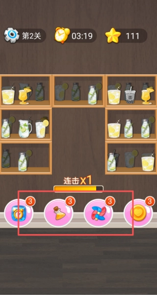 3、留意界面顶部的计时显示和星级进度条,在限定时间内尽量完成更多消除动作,另外要关注货架上饮品摆放位置的变动,随时调整滑动的策略。