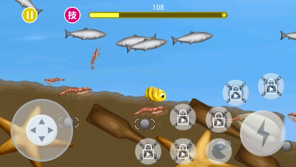 1.基础操作:滑动屏幕来操控小鱼的移动方向,精准锁定并吞食体型比自己小的生物以获取能量。