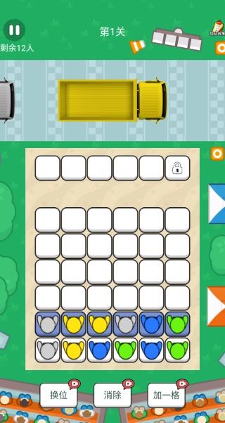 2、进入第一关,当前关卡还剩12人,先借助“消除”功能把多余的灰色角色移除掉,再通过“换位”功能来调整同色角色的排列顺序。
