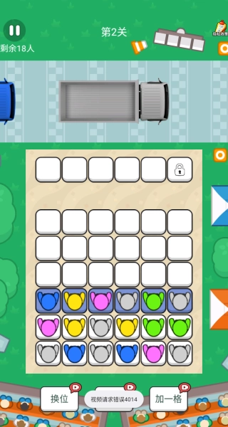 4、这一关卡里,首先要留意剩下18人的分布情况,借助“换位”功能来调整不同颜色角色的站位,要是空间不够的话,就用“加一格”来扩大区域。