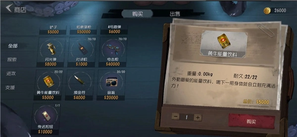 3、黄牛,重量0.00kg,耐久22/22,这是外勤人员最爱的能量饮料。喝下一瓶,身体会立刻充满活力,喝完就连怪物都追不上你,不管是赶路还是逃跑都派得上用场。