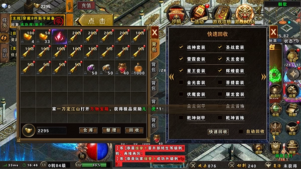 当我们的背包装备装满后,可点击快速回收功能,把多余的装备转化为金钱。