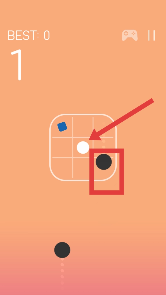在游戏进行时,会有黑色的球出现,玩家需要通过滑动屏幕之类的操作,操控白色的球移动,避开黑色球的碰撞。