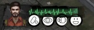 心情(笑脸图标):简直是无时无刻不在往下掉,连睡觉的时候都没能幸免,绝对算得上前期游戏里的“杀手”之一(毕竟心情低落到极致可能触发抑郁状态,甚至导致角色自杀);前期能用来恢复心情的道具少得可怜,而且每次恢复的效果也很有限,只有等后期科技发展起来,造出充气娃娃或者做出美味的食物,才能勉强摆脱这种困境,当然你也可以用对应的物资去找NPC互动来缓解心情。