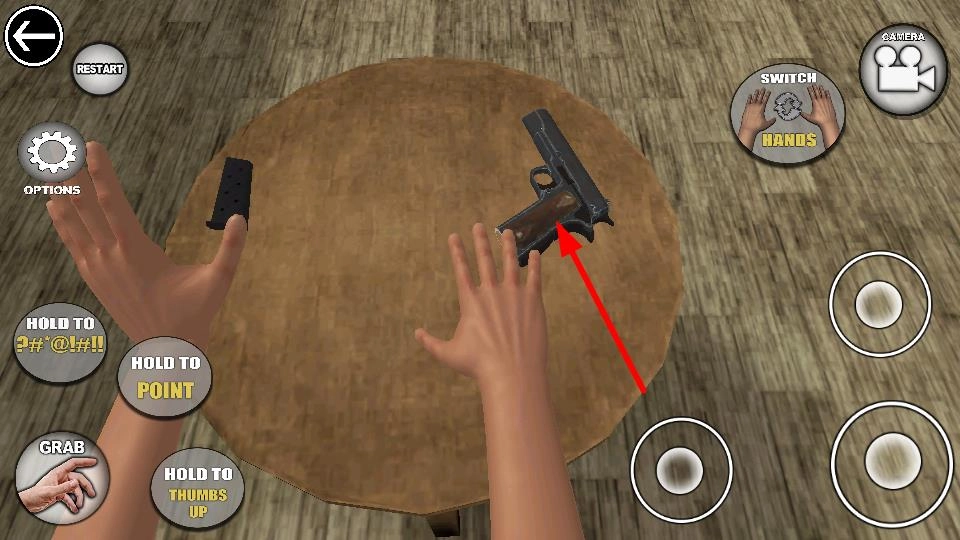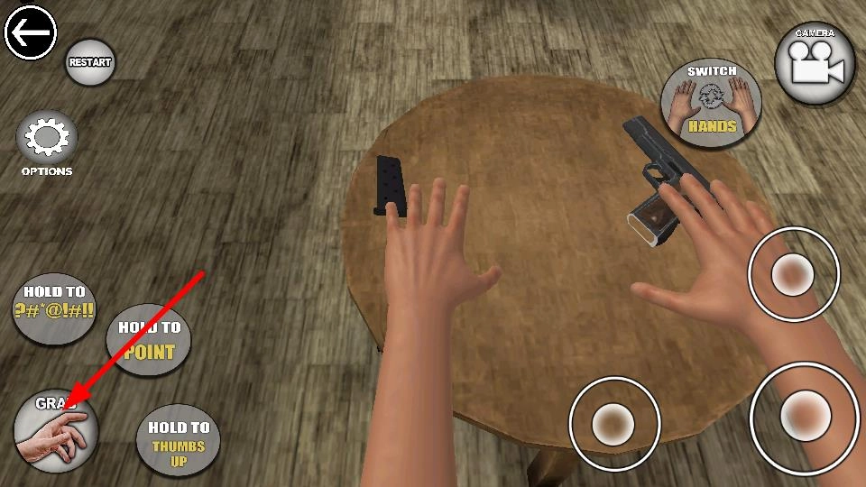 点击GRAB按键,操控手部执行动作,拾取桌上的枪械部件,完成枪械的组装或基础操作。