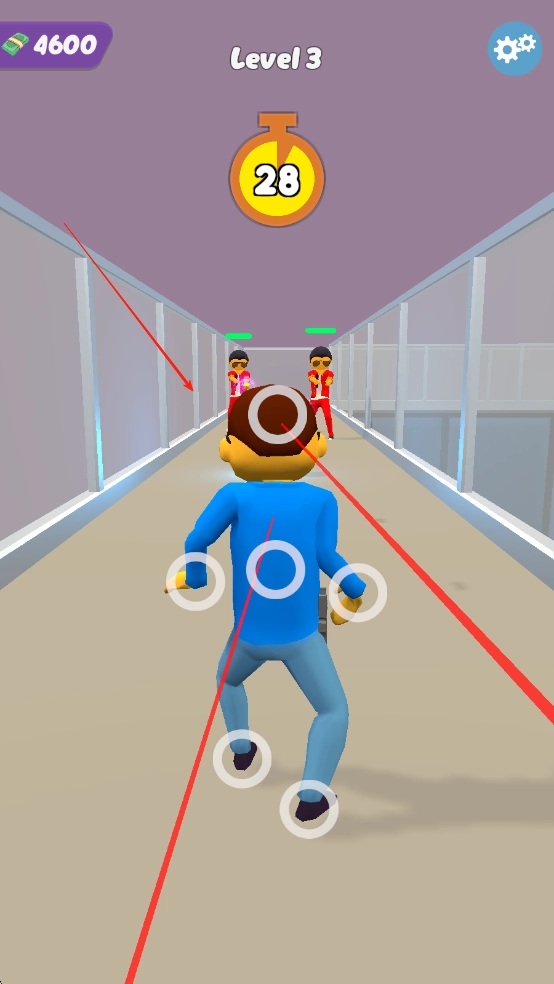 角色向前奔跑时,前方会出现持枪的敌人,我们需要在限定时间内,通过摆动头部、手部、脚部和腰身这四个部位,来躲避射来的子弹。