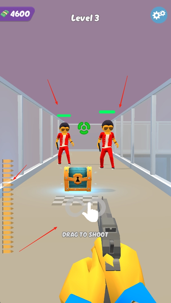 避开子弹之后,我们就可以用枪进行反击,把绿色的准星对准敌人就能发射子弹,需要留意子弹数量是有限的,得在子弹耗尽前打倒所有敌人。