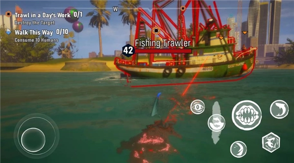 1、通缉与对抗机制:游戏中有类似GTA的通缉系统,玩家作恶太多会招来人类的捕杀,不同等级的猎鲨者会前来追杀玩家,其中精英猎鲨者相对难缠,但玩家跳起来一口也能结束他们的生命,不过大量拿着鱼叉枪的敌人会比较麻烦。干掉前来猎杀的人类也能获得不菲的报酬。
