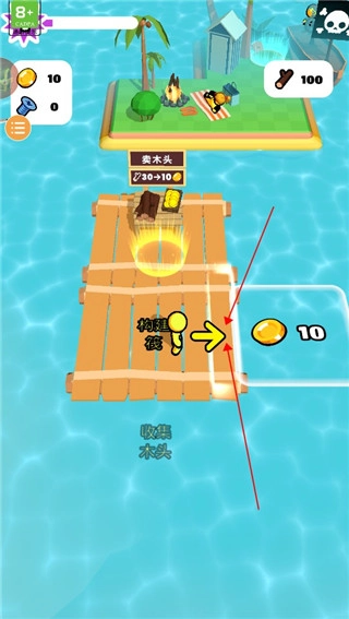 收集到的木头能用来兑换钱币,这些钱币可以帮助我们建造新的木筏,让我们得以抵达岛屿;而有了钱币后,只要站在木筏前段,就能进行新木筏的建造以及其他相关建造工作。