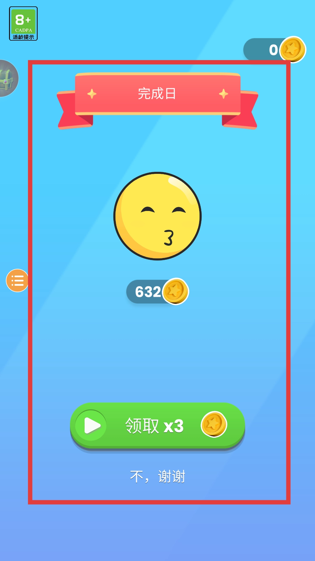 通关结束后会跳转到完成日奖励页面,该页面采用蓝色背景,清晰展示金币奖励内容。玩家点击领取按钮可获得三倍金币,也可以选择【不,谢谢】选项直接领取基础金币。