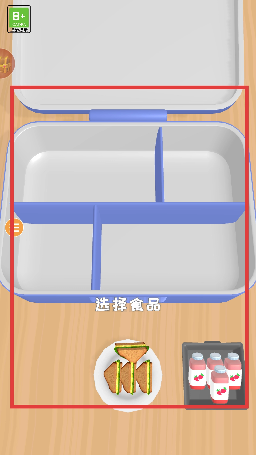 进入饭盒已备好的关卡界面,界面上展示着带隔层的蓝色餐盒,下方陈列着三明治、草莓汁等食物,需要把这些食物拖动放置到餐盒的隔层中,要依据餐盒的空间布局来合理安排摆放。