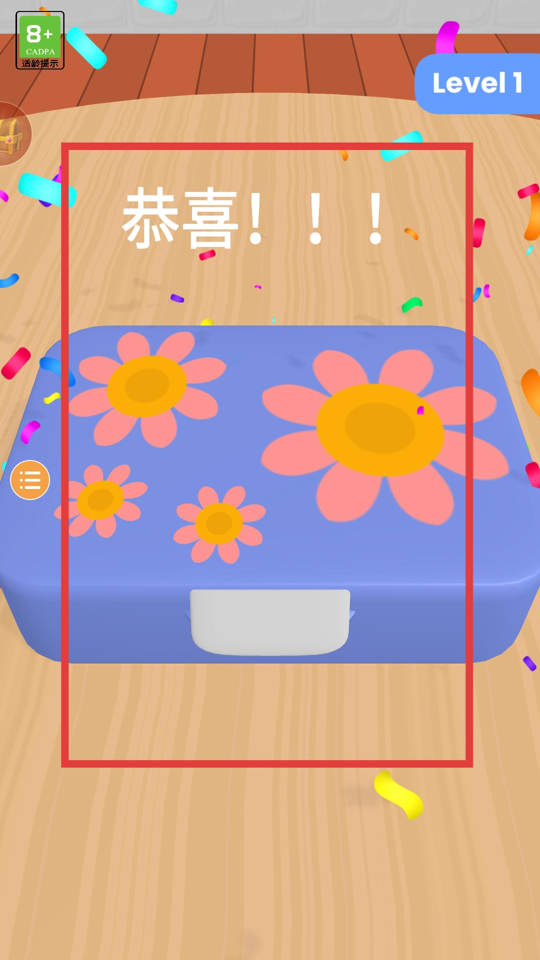当把食品成功放进餐盒的每一个隔层后,就会触发通关动画,屏幕上会出现“恭喜”的字样,同时还有五彩纸屑纷纷飘落,餐盒的盖子上也会浮现出粉色的花朵图案。