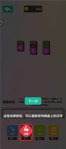 2、提供洗牌道具可刷新整体布局,重新排列汉字位置,有助于发现新的成语组合。