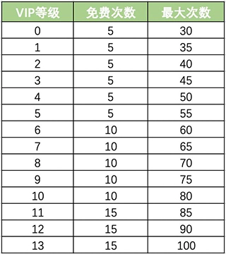 备注:次数以当日0点为准,若该日0点以后VIP等级发生变化 其免费次数与最大次数不变(系统更新当日以更新后VIP等级为准)