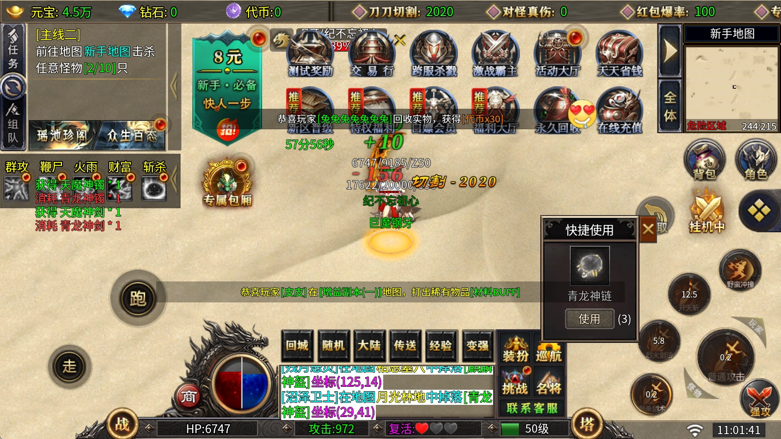 游戏里所有货币都能免费获取,打怪就能掉落实物奖励,这些实物能直接兑换成充值额度,世界BOSS更是必定掉落真实充值福利。