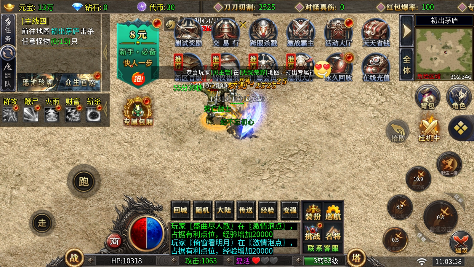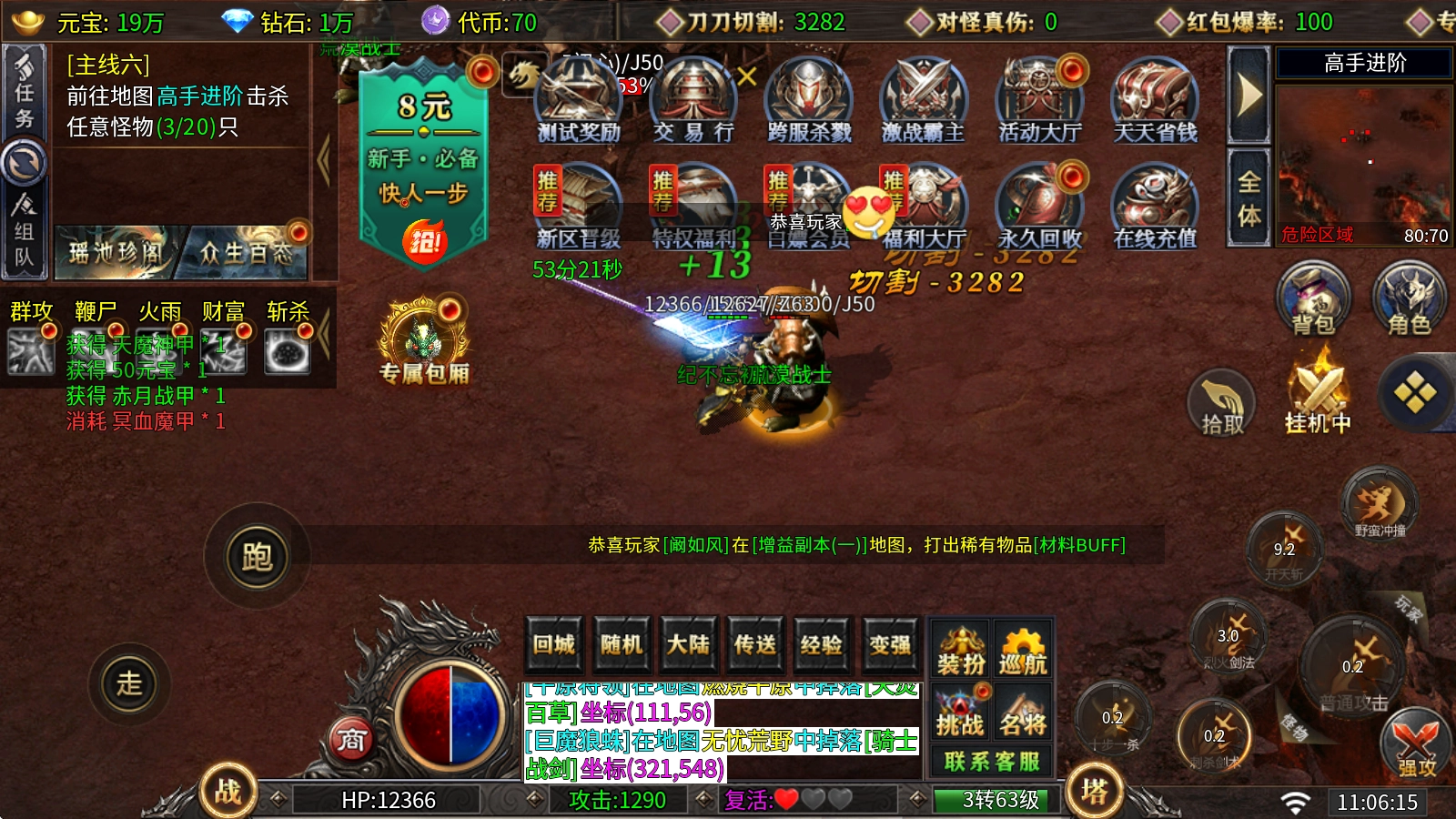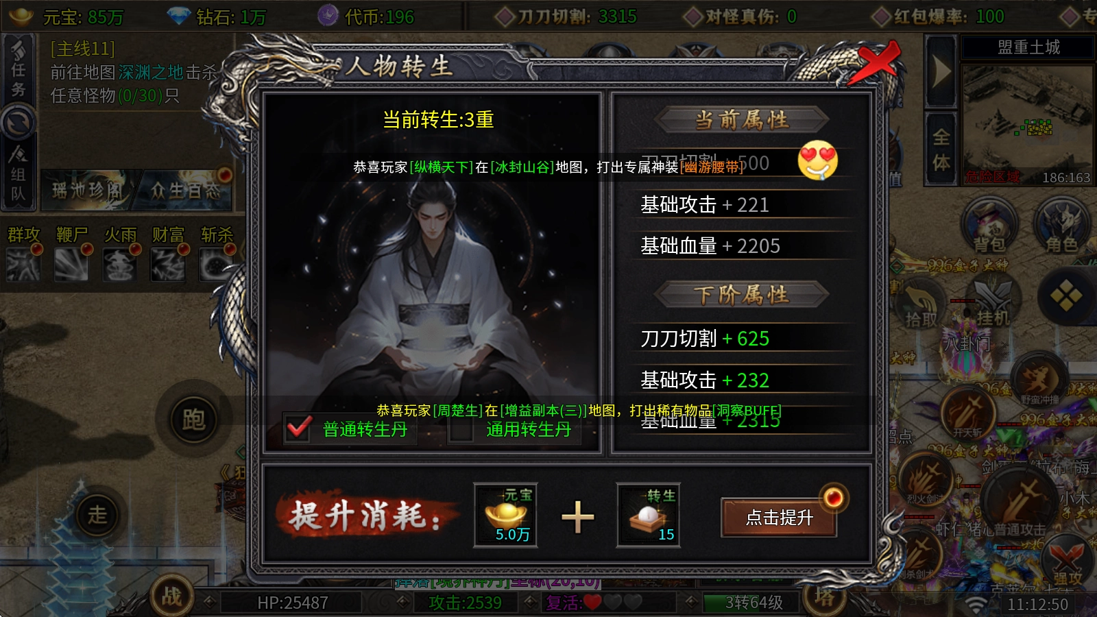 角色转生系统:消耗元宝与转生丹即可完成晋升,每提升一级不仅能获得攻击与血量的属性加成,还能显著提高切割伤害。